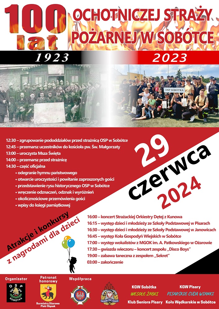 Ochotnicza Straż Pożarna w Sobótce zaprasza na obchody Jubileuszu 100-lecia OSP w Sobótce 29 czerwca 2024 r.