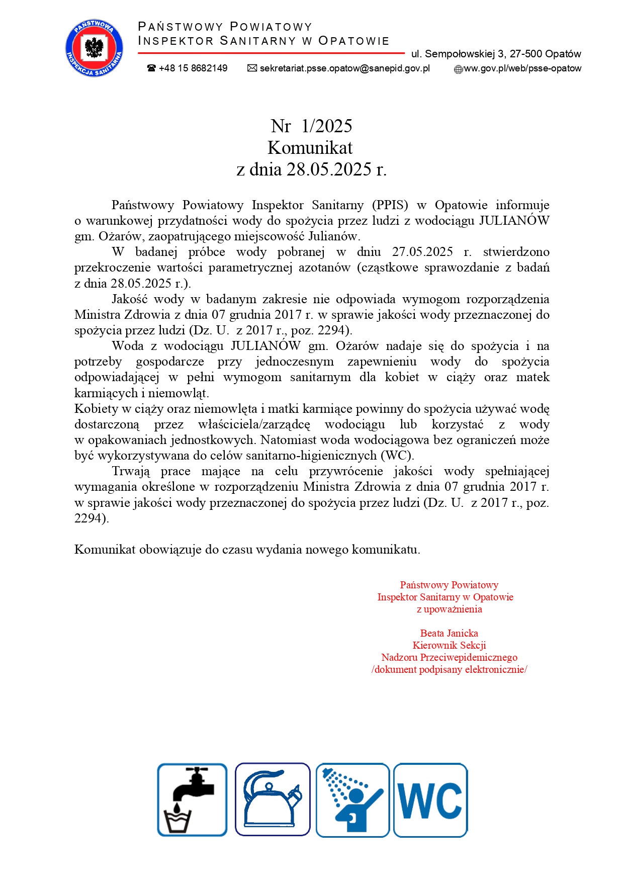 W związku ze stwierdzonym przekroczeniem wartości parametrycznej azotanów, Państwowy Powiatowy Inspektor Sanitarny w Opatowie opracował Komunikat nr 1/2025 z dnia 28.05.2025 r. w sprawie jakości wody przeznaczonej do spożycia przez ludzi, celem dalszego rozpowszechnienia dla odbiorców wody z wodociągu Julianów gm. Ożarów zaopatrującym w wodę miejscowość Julianów.