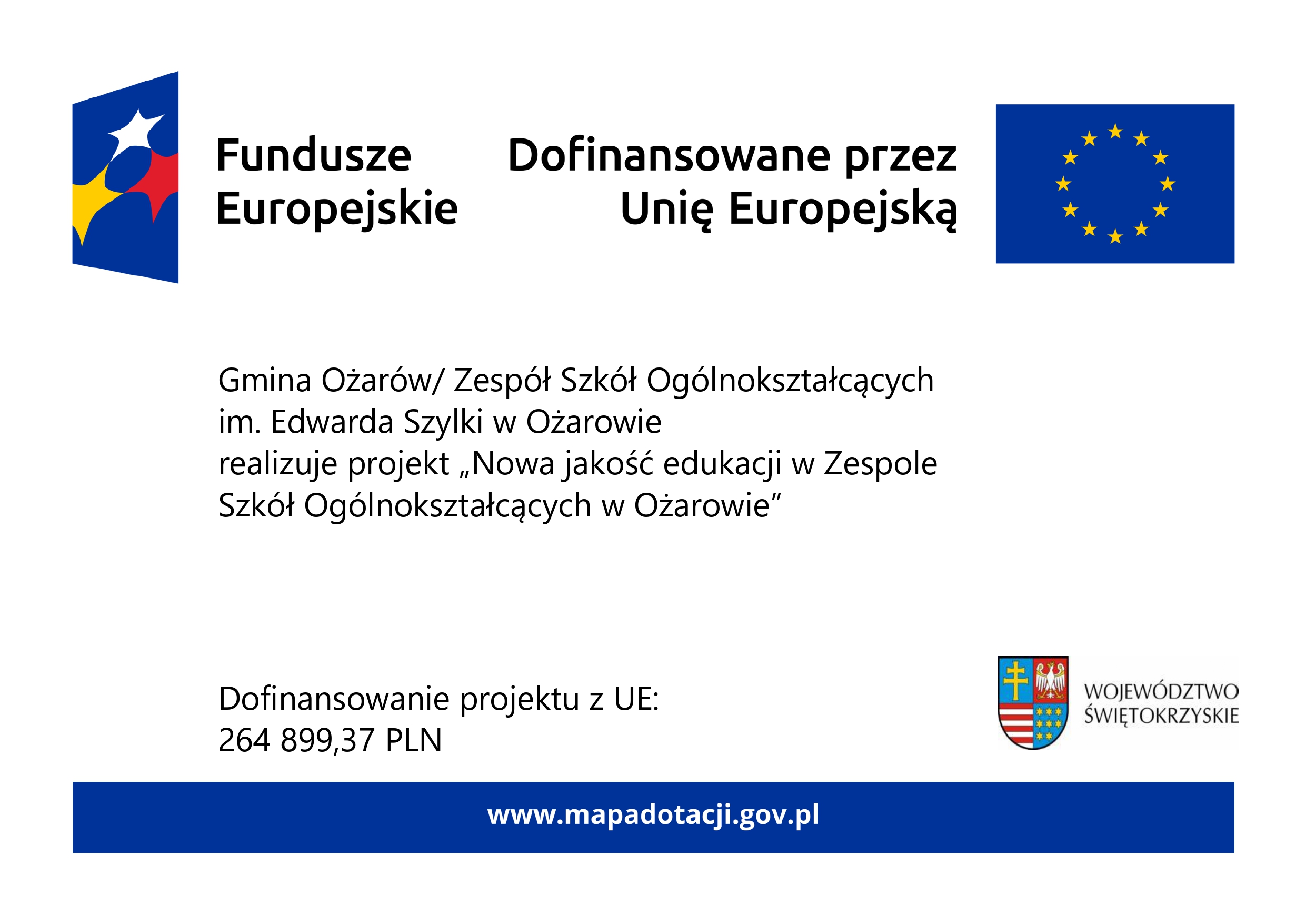 Gmina Ożarów/ Zespół Szkół Ogólnokształcących im. E. Szylki w Ożarowie realizuje Projekt „Nowa jakość edukacji w Zespole Szkół Ogólnokształcących Gminie Ożarów współfinansowany ze środków Europejskiego Funduszu Społecznego w ramach programu regionalnego Fundusze Europejskie dla Świętokrzyskiego 2021-2027.