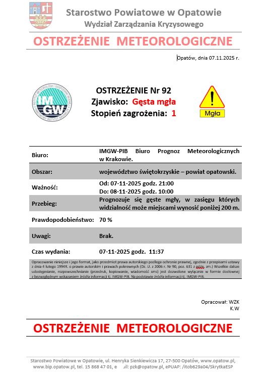 Ostrzeżenie meteorologiczne - gęsta mgłaArchiwum