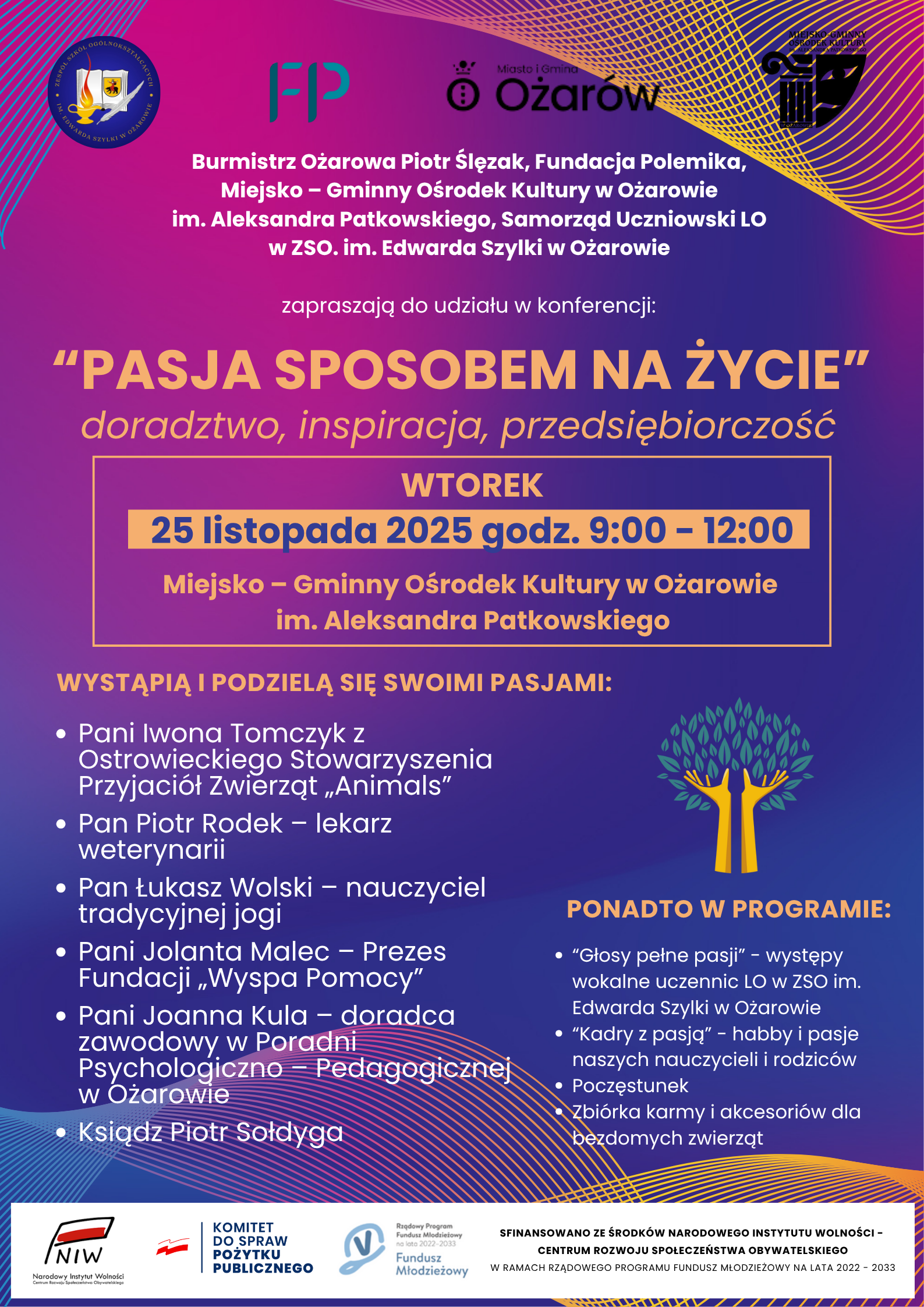 Samorząd Uczniowski Liceum Ogólnokształcącego w Zespole Szkół Ogólnokształcących im. Edwarda Szylki w Ożarowie zaprasza do udziału w konferencji: „Pasja sposobem na życie – doradztwo, inspiracja, przedsiębiorczość”, która odbędzie się 25.XI.2025 w godz. 09:00 – 12:00 w Miejsko – Gminnym Ośrodku Kultury w Ożarowie im. Aleksandra Patkowskiego.