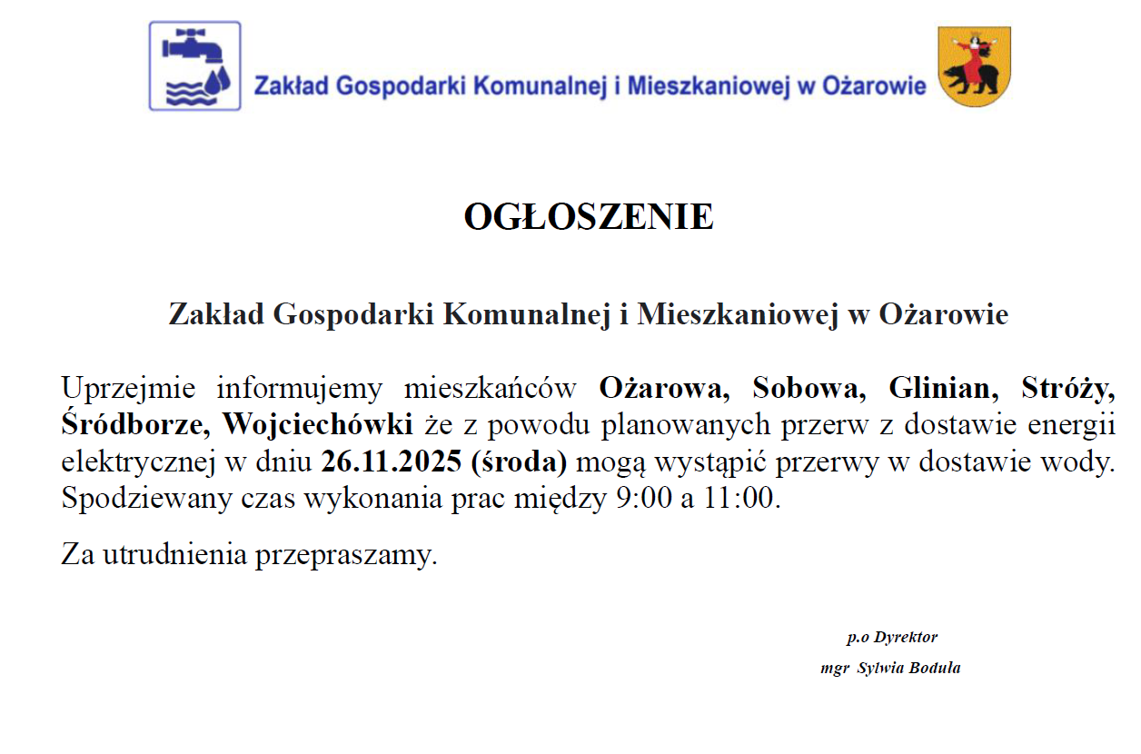 Możliwe przerwy w dostawie wody, w dniu 26.11.2025 r....Archiwum