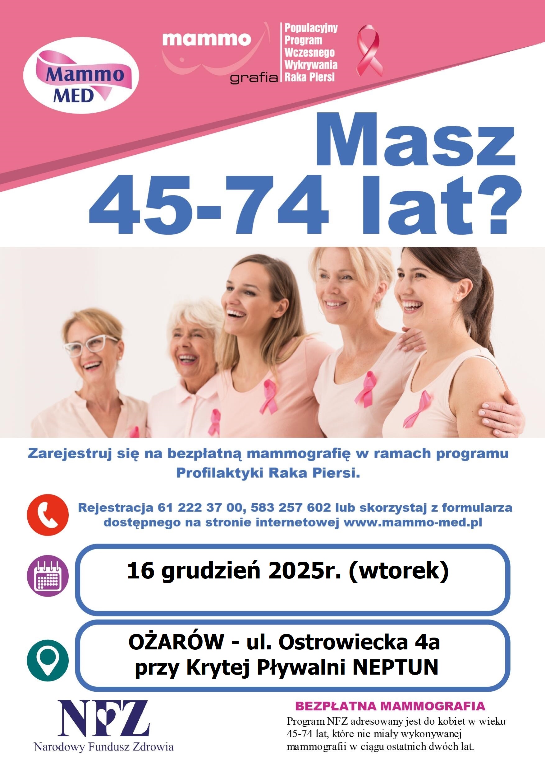Mieszkanki Gminy Ożarów (w wieku 45 - 74 lata) zachęcamy do zapisów na bezpłatne badania mammograficzne w dniu 16.12.2025 r. Szczegóły na plakacie.