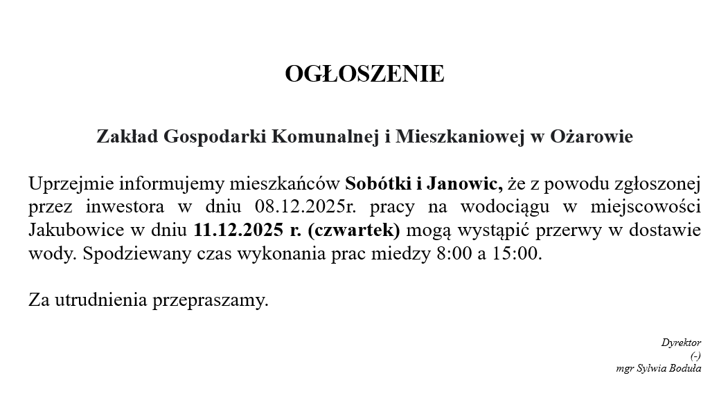 Informacja - przerwy w dostawie wody - Sobótka i Janowice